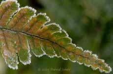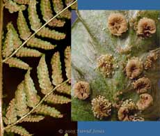 The photograph of a fern frond back on the 12th shows brown patches on the upper side. These mark the spots where structures called sori are found on the underside. On this fern each sorus consists of a roughly kidney-shaped 'umbrella' called an indusium under which are a large cluster of stalked capsules (sporangia), containing the fern's developing spores.