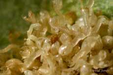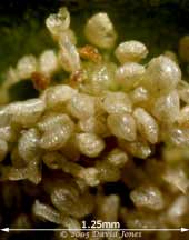 As they continue to dry, the annuli eventually spring back again to scatter any remaining spores. In this photograph the straightened annuli look like small worms amongst the debris of the torn sporangia. The image shows an area approximately 1.2x1.75mm.