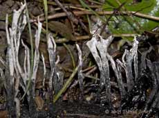 Hidden beyond the far end of the pond is a piece of well rotted timber. Along one edge of it is an almost seasonal looking growth of Candle Snuff fungus (Xylaria hypoxylon).