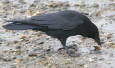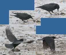 They would forage about in the sand searching for bivalves near the surface. Once one was found the Crow would hold the shell with one foot as it tried to prise it open (pic 1). If that failed, the bird would pick up the shell in its beak, take off (pic 3) and fly to an area of gravel (pic 4). There it would drop the shell from a height of 5ft or so onto the stones below.
