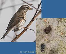 24 February - Well, yesterday's warning of overnight snow was greatly exaggerated. This morning we awoke to another sprinkling of white over the garden and rooftops, but with the outside thermometer still reading 1.5C most of the snow has already melted away. At 9.20am we are having the snow version of a fine drizzle, and that is having no effect on the ground. I did a quick check for footprints in the snow. Apart from some Blackbird tracks on our veranda and elsewhere, there were no fox (or cat) tracks to be seen. The Redwings are still visiting (at least, I have seen four here). This morning I noticed them being harassed by a couple of Sparrows. At one time there were Redwings, Goldfinches, Sparrows, Blue Tits, a Chaffinch and a Blackbird in the Birch - an unusual sight. I should mention that the Blue Tits are now regular visitors to my neighbour's old nestbox, and that there is still no sign of any birds taking an interest in my main main nestbox. The female woodpecker visited the peanuts briefly, and the Magpie returned again, but after a pause in the Birch it left without a repeat of yesterday's attack. The Song Thrush has already been here several times this morning, preferring to tuck into some insectivorous bird food that I put out occasionally, rather than the raisins favoured by the Blackbirds.