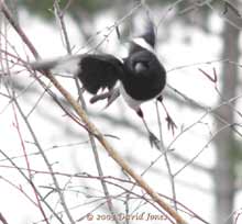 It pounced in a very characteristic hawk way, swooping onto the Hawthorn from my neighbour's tree, and then flying around it before landing in our Birch. I had just pointed the camera and focused when it launched itself from there, straight at the Hawthorn again, and this time succeeding in scaring several Sparrows enough to take flight. It was last seen chasing one of them away across neighbouring gardens. I know that Magpies will take young birds during the nesting season, but this is the first time that I have even seen one hunting adult Sparrows in this aggressive way. In the past we have often seen the Magpies about, usually in pairs, and especially when following the Sparrowhawk about as it hunts - This individual seems to have learnt a few techniques from the master!