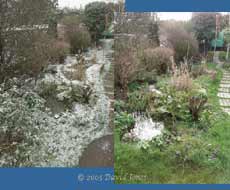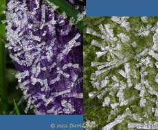 Needless to say, the ponds and birdbath were frozen over, and the ponds remained covered all day. Despite the low temperature there was little in the way of 'photogenic' frost, so I ended up on hands and knees taking these close-ups. They show very similar columnar ice crystals on a Crocus flower head (left) and a Primrose leaf.