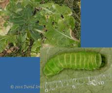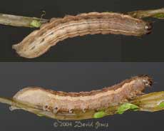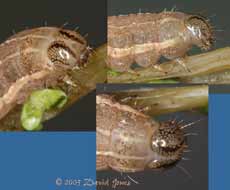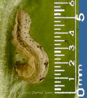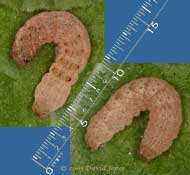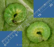 The first, and largest at about 17-18mm, is this green individual which promptly fell off the leaf and remained curled as shown here. This one has a much lighter head than the green one photographed a couple of days ago, and doesn't have such boldly marked spiracles.