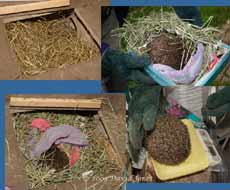 While in the workshop, Horace slept in a tray (top-right image) that I could easily lift out when I cleaned its enclosure. Before moving it to its new 'home' I weighed it (bottom-right image). It is now an impressive 745g. The bottom-left image shows it just after being placed in the hedgehog house. When I checked it a couple of hours later it had completely disappeared under the straw. I've placed the sensor of an electronic thermometer in the straw to monitor the temperature in there. It was around 9.5C this evening.