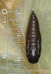 Hanging underneath another well eaten leaf on the same plant I found this very small chrysalis. At just 6mm long it seems much too small to be from the same caterpillar type. The rain started to fall before I could take any further pictures.