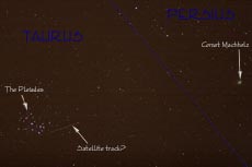 This picture was taken at 6.20pm and that part of the sky was almost vertically above me. When you look at the larger image, the Pleiades is in the bottom left corner and the comet is the fuzzy spot next to the star you can see half way down the right side of the image.