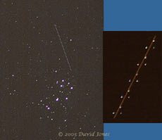 In the first picture it is possible to see two streaks on the image in the region of the Pleiades (again, you will need to look at the larger version). While I cannot be certain about the first one, I am sure that the feint line is a satellite passing overhead. The right hand image shows what an aircraft trail normally looks like, with its navigation lights flashing on and off.
