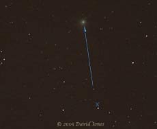 I thought I'd include another image to show how much it has moved in the 24 hours since my first picture. I have marked that first position with a blue cross. To see really spectacular images of Comet Machholz, visit the website of Waldemar Skorupa and Norbet Mrozek in Germany.