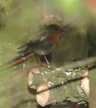 One regular visitor that is very wary is the local Robin. It often comes down under the Hawthorn, but rarely comes into the open. This image was grabbed as it perched on a new log pile behind the hawthorn, overhanging branches shielding it from the light of the flash. In this picture, the black and orange cables are two of the leads used to connect the house to the cctv cameras at the bottom of the garden.