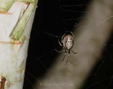 31 January - Another cloudy morning, although there are a few signs that there is blue sky beyond the grey! It's nearly 8C at 9am and dry - we have not had much in the way of rain during the month, and only a couple of frosts. Last night Horace was seen going out at around 10.30pm. It must have returned before 3am. The video recording from then until 7am remained 'empty' until the hedgehog emerged from its house at 6.55am and remained at the food dish until recording finished at 7.05am. A check of the house temperature (11.1C) at 9.15am confirms that Horace is in there. One picture from last night. There are few webs to be seen in the garden at the moment, but this spider produces one regularly under a lower branch of the Birch tree and appears on it each night. During the day it retires under a fold in the peeling bark.