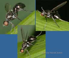 You had to look closely to see this last one. This was a tiny black fly that spent its time waving its wings furiously as it ran about on Iris leaves. This habit, along with its wing venation suggests that it is either a Sepsis fulgens, or a close relative.
