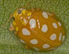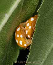 I can how count at least a dozen adults, including this one at rest under a leaf. Its head is almost completely retracted under the pronotum (the hard covering of the thorax) and because this is almost transparent you can still see the eyes quite clearly. You can also see through the edges of the elytra.