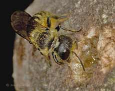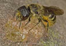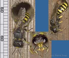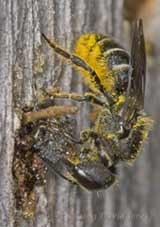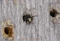 A couple of centimetres away another solitary wasp has also moved into a 3mm hole. The light powder that has coated its thorax is dust from the holes it has been examining.