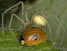 Here, a Two-spot Ladybird has blundered into one of the many webs that coat the upper parts of plants around the garden. It seemed to present an interesting challenge for the spider, which eventually got around the ladybird's hard exterior by attacking the tail-end of its abdomen. A few minutes later it was taken into the heart of the web, under a partly folded leaf.