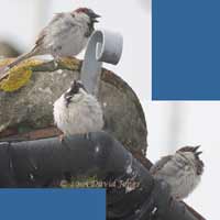 The fledgling (bottom-left in this picture) has its head down, is fluttering its wings, and is swaying from side to side as it begs to be fed. The twittering that goes on when the family group is in the garden has a very 'bubbly' quality to it, and is far from the usual sound we usually hear.