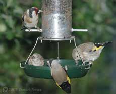 7 July - The weather is trying to improve, and we have had some sunshine today, and a heavy downpour. Yesterday there was the great news that the 2012 Olympics are coming to London, and today the Capital has been hit by terrorist bombs that killed dozens of people - what a crazy world. One of my sons works each Thursday in the affected part of the City. Fortunately he had gone into work early, before the attacks took place. Back to the garden - I'm still having a problem with my energy levels so very little is being done. The Blackbirds also seem to having problems. Yesterday the female was sitting on the nest nearly all day, but today, although she comes to feed under the Hawthorn, I haven't seen her on the nest at all. This afternoon I checked the nest with a mirror and I cannot see any eggs. The nest doesn't look damaged, but it does look as though she has lost another clutch. In the meantime the male is still taking mealworms away. I'm still only seeing activity in the middle House Martin nest, so it looks as though we have only one growing family there so far. It's interesting to see how the House Sparrows have now resumed their interest in the seed feeder after several weeks of little or no interest. The young Robin appears frequently under the Hawthorn, and there was a Dunnock here again today. We get an occasional visit from the local (small) flock of Starlings and their offspring which are now feeding for themselves. The most obvious birds here at the moment are the Goldfinches which can be seen or heard almost all day. First thing this morning there were four adults and at least three youngsters here, although they didn't oblige by staying together for a photograph.