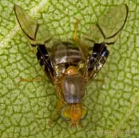 On another leaf this fly was roosting. The wing pattern suggests that it is a Phagocarpus permundus. The larvae of this species develop in hawthorn fruits.