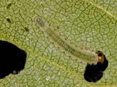 Quite a few Birch leaves have holes in them, but I rarely see what is causing them. However, three nights ago I spotted this larva, which I guess is that of a sawfly.