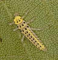 Some time back, I commented about the galls that had appeared on my Sessile Oak tree (in a pot). These have shrivelled away completely, but now a few of its leaves have fallen victim to the ravages of a saw fly's larvae. These larvae are known as Oak Slug worms. Although they appear quite slug-like, they do have reduced legs. They are the larvae of a sawfly, probably Caliroa annulipes. The larvae work on the undersides of leaves, eating all the soft tissues and leaving these areas skeletonised, but leaving the upper surface untouched. While we are starting to see Orange Ladybird activities on the Birch, over the rest of the garden, ladybird (and ladybird nymph) numbers appear very low after the variety that appeared earlier in the year. There are plenty of aphids about, so ladybirds and their should have 'easy pickings'. However, they don't always get their own way.