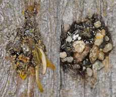 These two images show variations in approach to finishing the job. The left-hand plug appears to be decorated with a variety of plant fragments, while the bee creating theright-hand plug has used grains of sand to create a 'pebble-dash' effect on a 'dark treacle' base.