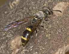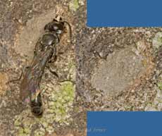 A near neighbour of the bee, this solitary wasp was also busy sealing its nesting hole. As seems typical of these wasps, its hole is closed up with a fine mud 'mortar' which usually dries to blend in very well with the suroundings.