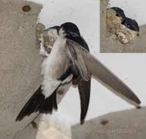 Over the last few days we have seen the chicks for the first time. This evening I spent some time watching the nest and captured this shot of one being fed, and the insert shows two chicks looking out for their next feed. Last year the Martins nested after we returned from our summer break. That must have been a second brood, so I shall keep my fingers crossed that a similar thing happens this time.