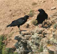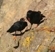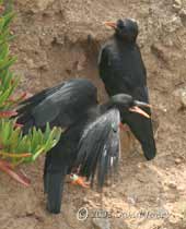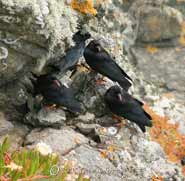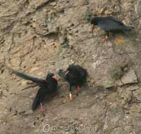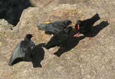 The parents are the same pair as nested here last year. They are always together and fly off as a pair to search for food on fields around the Lizard. When they return they swoop very quickly over the top of the cliff and into the cave. As they leave they often make their characteristic 'k'chuff' call. There are many Jackdaws around the LIzard Point and there are usually some around the cave. When they take off, especially as a pair, they cause the binoculars to be raised briefly until their black beaks and wings betray thay they are not the Choughs.