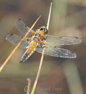 In lesser numbers, but never the less very obvious were the Four-spotted Chasers (Libellula quadrimaculata), broad-bodied dragonflies, that were dashing about just above the water surface with just occasional stops on the rushes near to me.