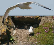 For those who have binoculars and are having cream teas(!) at the Polpeor Cafe down at the Point, this gull is nesting in full view, albeit at a distance. Look into the shadows and you can just make out the chick stretching its wings - it has a long way to go before it matches the adults! The nest is about half way up the cliff, but if you walk on the beach below you can find one of the adults swooping over you as it discourages you from getting too close.