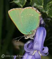 It is a Green Hairstreak (Callophrys rubi). Not a butterfly that I can recall seeing before, and certainly not one I will hope to see in the garden as it is a butterfly of scrubby habitats, hedgerows and heathland (which certainly describes this place). Although I didn't manage to photograph it, the upper surface of each wing is rather orange-brown in colour.