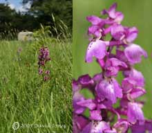 This picture is taken from the end of the wedge-shaped field which is surrounded by a mixture of pines and deciduous trees. That's us in the middle. The area behind me as I took the picture is left unmown by Pat, the owner, until the wild Orchids have finished flowering.