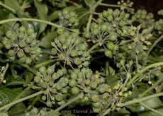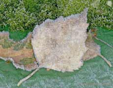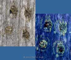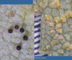 The right-hand image of this pair show how the upper leaf surface also shows a change when areoles are infected with the fungus. Although the yellow colour shows through, the fungus remains below the surface, only breaking out of the leaf on the underside.