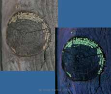 Towards the end of the piece of timber there is a wood grain pattern which shows the position where a branch would have been growing out from the tree. In both examples, as well as a bright yellow/green fluorescence, there are also patches of almost magenta colouring.