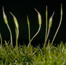Today I took another look at them and, as the picture shows, the tops of the spikes swell as they develop into the Sporogonia. These grow from the female moss plants after sexual reproduction took place back in May. In the Sporogonia, spores are now developing, but it will take until next April for them to be ready for dispersal. On a couple of the heads you can see the cap, or operculum which protects the special, toothed structure (peristome) which will allow the wind to shake spores out of the sporongium during dry weather only.