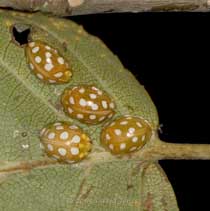 I know that ladybirds group together to hibernate during the winter, but as the leaf could fall at any time, I guess that this is just an overnight roost. I find it amazing how they end up in a group like this when the tree still has so many leaves to choose from and there is quite a small population this year. I should point out that I also saw a couple of individuals elsewhere on the tree, so they didn't all come together! Click on the images to see larger versions - |