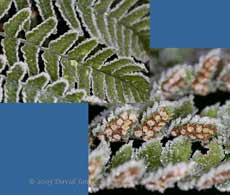 Down at ground level most plants started the morning with a coating of frost, with the more exposed fern fronds having bold, white edges to them.