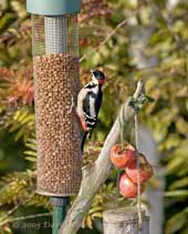 This shot give you a chance to see the drainpipe insert in the peanut feeder. It was put in so that while the feeder has a large external circumference it doesn't contain excessive amounts of peanuts that may otherwise become stale before they are eaten.