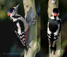 These are cropped images of the Great Spotted Woodpecker as it investigated the branch that is bolted to the feeder's support. Unlike on the last visit, this time the red patch at the back of the head (indicating that it is a male) is showing clearly. I wonder if/when we will see a female here this winter. The holes in the branch are sometimes filled with fat or peanut butter (with bits!), but not this morning. - they are now! The Song Thrush visited again early on, but again there wasn't a photo-opportunity. There has only been one Goldfinch during the morning.