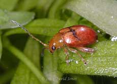 Also, I found two small orange coloured beetles floundering on the pond surface. As I rescued them, one jumped a matter of nearly six inches into the undergrowth of the pond bank. Fortunately this one stayed on the pondweed long enough be photographed. They are obviously flea beetles, possibly