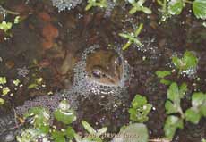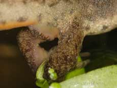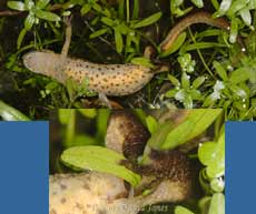 The frog's pointy snout indicates that it is a young one that wouldn't have been involved in spawning this Spring. There are numerous of these in the pond, probably having developed from spawn in this pond, and which will form the basis of future generations here. At night, many of the newts continue to congregate in the shallow end to feed on the smaller tadpoles, although some are now too big to fall victim to the predators. At the other end of the pond egg-laying continues. It's amazing to compare the newts with the frogs. While the female frogs produces all her spawn, anywhere between 1000-4000 eggs! On the other hand, a Common (Smooth) Newt female lays up to 400 eggs - just one egg at a time, from 7 to 12 eggs each day. This means that it can take up to nearly two months to complete her task, with the first eggs hatching out after about 2-3 weeks, long before mum has finished. I have started to take some close-up images to try and show progress in the development of the eggs. I hope to get a more 'complete' set of photographs over the next few weeks, but in the meantime, I'll put some images into the diary either tonight or tomorrow -