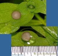 This egg is even more exposed, very close to the side of the pond. The top image was taken last night, shortly after it was laid. The lower image, taken this morning, shows that cell division has begun (possibly four cells at this point?). The scale, floating on the water next to it, shows that the egg is about 1.25mm across, with an albumen jelly protective sphere of around 2.5mm diameter.
