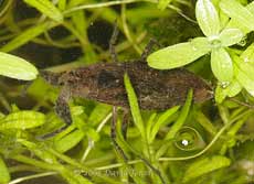 during August in previous years (recorded in the garden diary) The black line across its back seems to be some sort of damage rather than a marking. While I was lying down to take these pictures a large Water Scorpion suddenly appeared right in front of me, not in the water, but on land, but heading back into the pond, probably having been disturbed (and almost squashed!) by me.