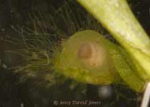 Considering that the newt lays her eggs 'blind', as it were, it's not surprising that sometimes the egg doesn't end up hidden. underneath a leaf. In this shot you can see a newt suspended in open water as she lays an egg, and to her right you can see an egg laid earlier, near the base of a leaf, and on top of it.