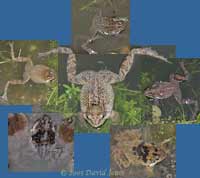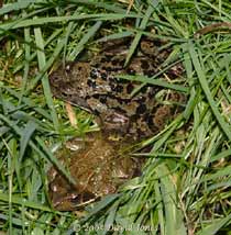 The colours and spot patterns of the frogs vary tremendously, but today one frog stood out from the crowd with a pattern that I have not seen before. The frog in the middle of this group has a very speckled pattern of small spots on a very light background. Compare it with the more usual variations shown by the other frogs.