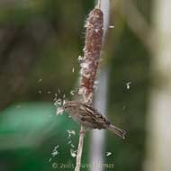 This one was spotted on my last walk down the garden before bed last night. It was up on the West Wing, hunting along the grooves in the stepping stones under the Ivy tree, amongst the rotting remnants of the winter. During the same walk I saw at least fifteen more in the big pond, and one in the small pond. This morning the pond diary gains a bird photograph. Back in January I mentioned that one of the Reedmace seed heads had been attacked by a bird. It wasn't long before the head was stripped clean, not by birds, but by winds.