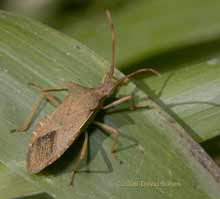 My coffee was interrupted by this bug (with what looked like quite bold banding on the upper surface of its abdomen) flying to the bamboo plants. Superficially similar to the Dock bug I photographs a few days ago, this one is 'slimmer', with lighter coloured legs. I believe that it is a Box Bug (Gonocerus acuteangulus).