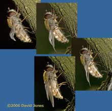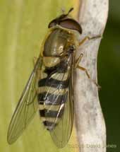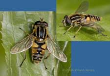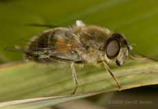 and the second is this larger hoverfly. I think it may be a Drone-fly, although I didn't have a chance to get a photograph from above to check its abdominal markings, which do not show up in this shot.