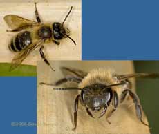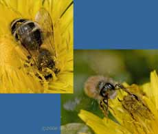 Here, a similar bee was busy collecting pollen from a Dandelion, showing more clearly the wing venation. The lower image was an accidental capture when (I presume) a male swooped on the female. Notice how it has a hairy 'moustache' which is absent in the female shown above.