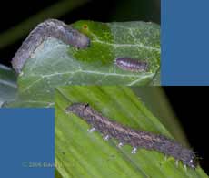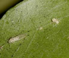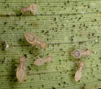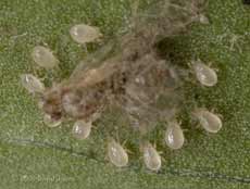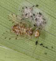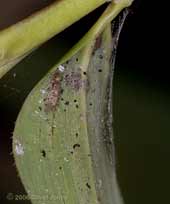 On several other leaves I was able to see nymphs without adults present, their position clearly indicated by the large number of droppings stuck to the silk threads that they make. As usual, they were on the underside of the leaf, and reacted to the leaf being turned over by running around. As soon as I took this picture I turned the leaf back over to (hopefully) avoid them becoming dispersed.